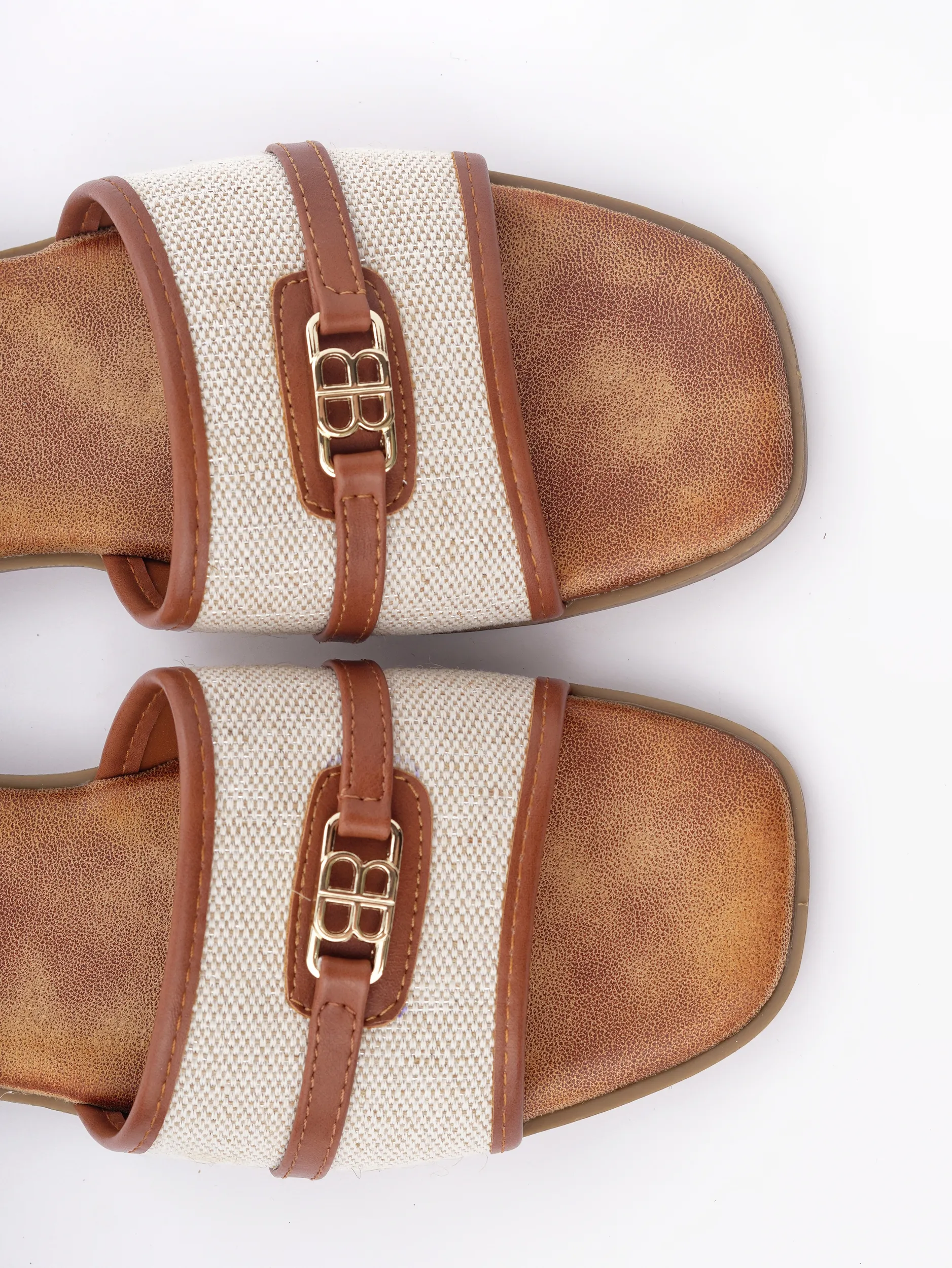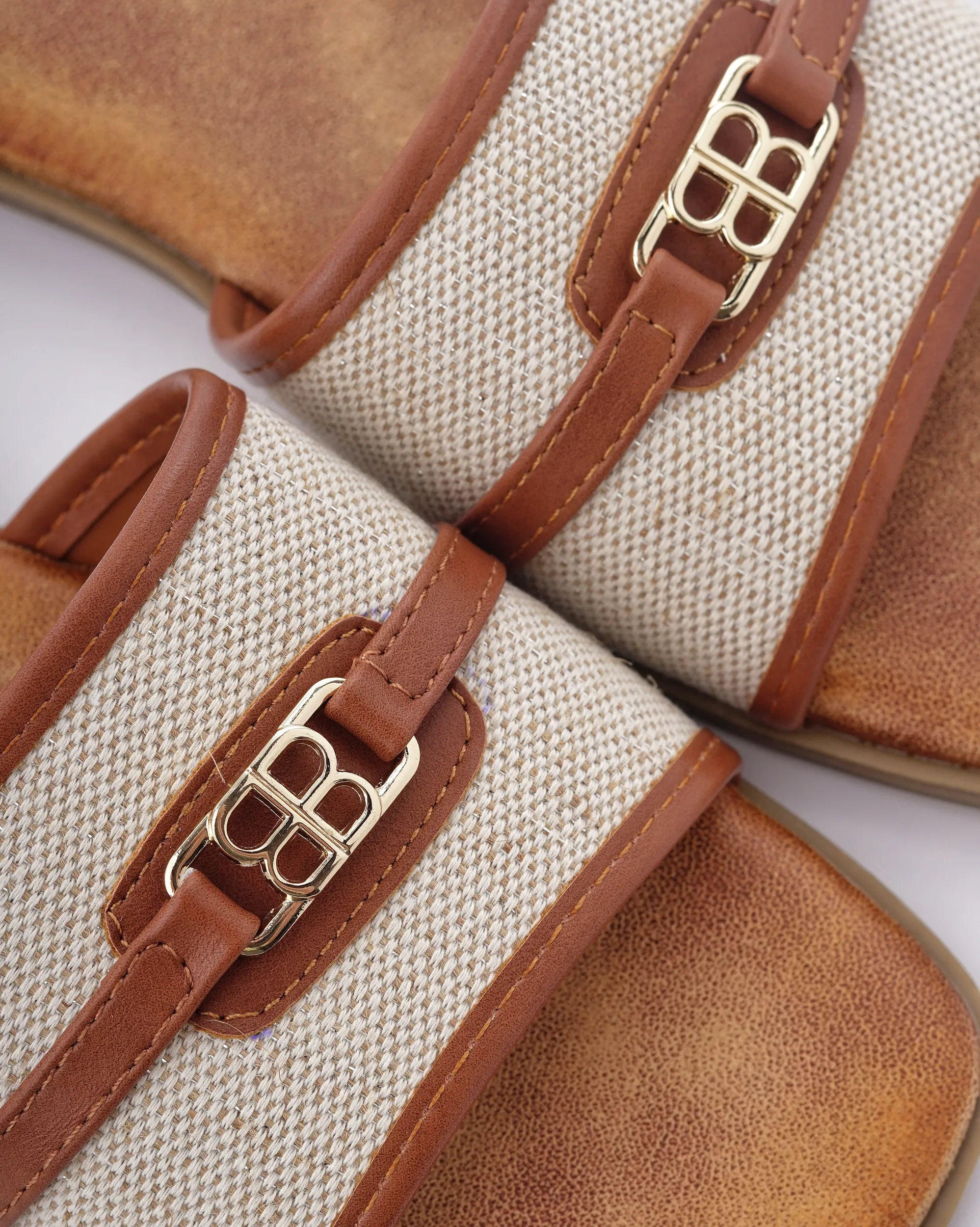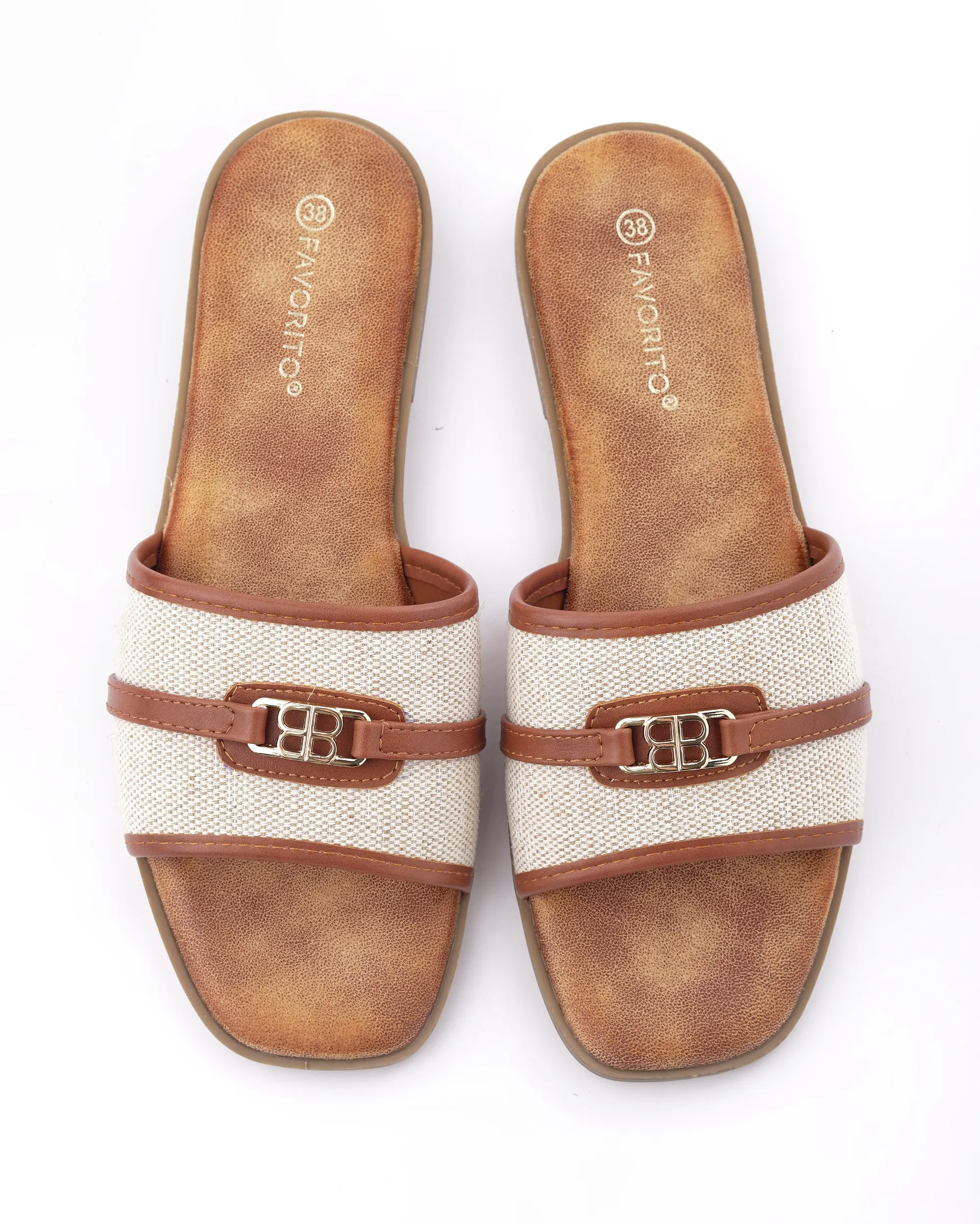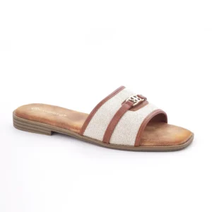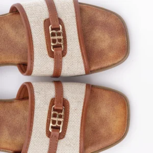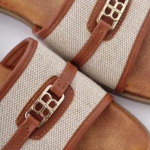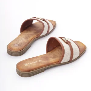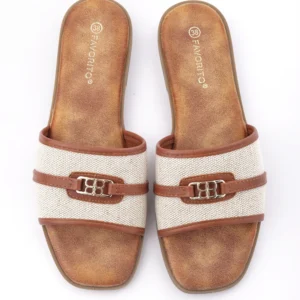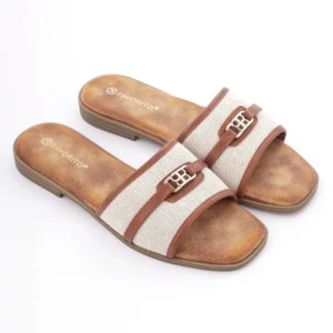 Ove elegantne papuče izrađene su od visokokvalitetne kombinacije tekstila bež boje i detalja od braon eko-kože. Karakteriše ih moderan dizajn sa zlatnom šnalom i ravan đon, što ih čini savršenim i laganim izborom za tople letnje dane.
