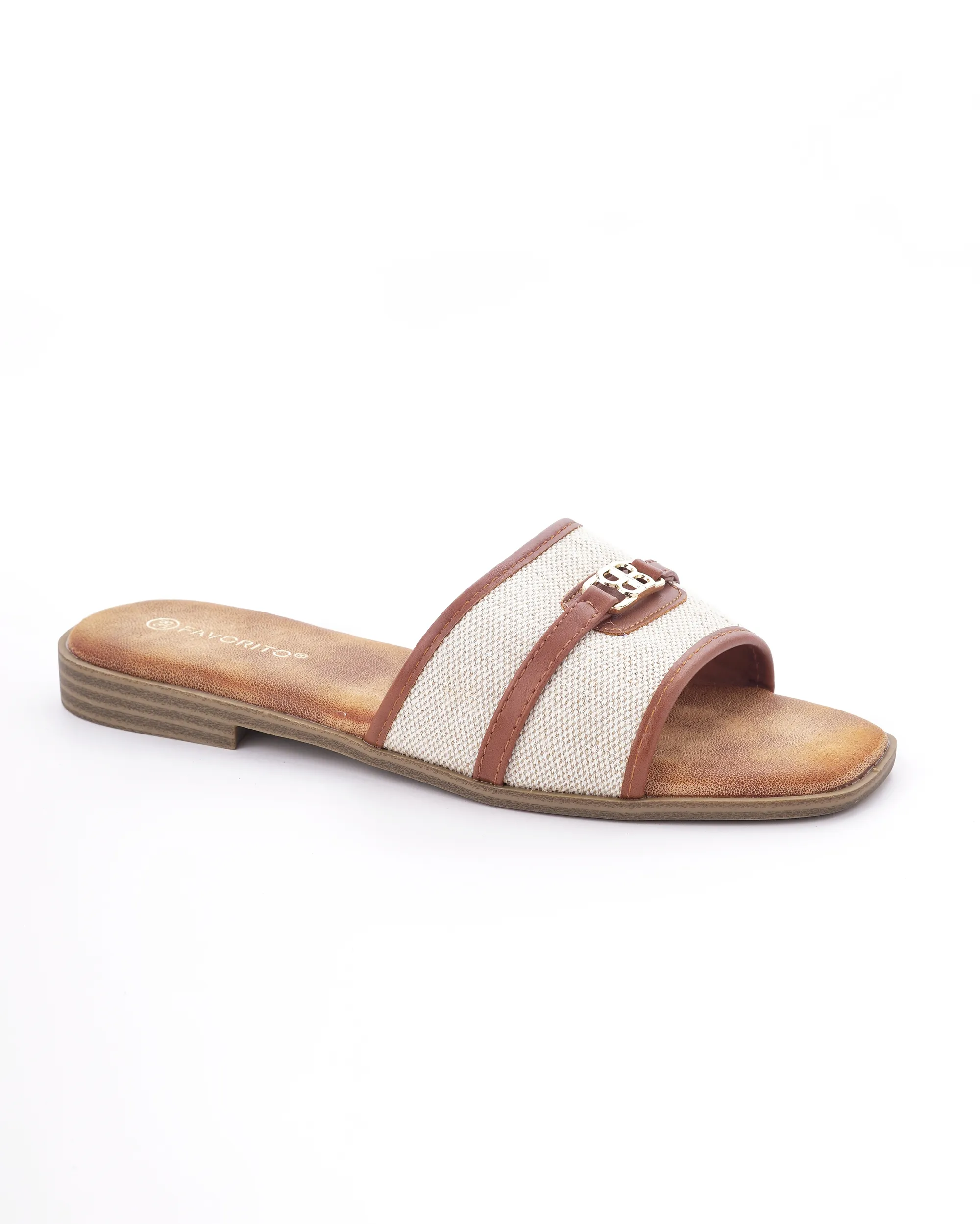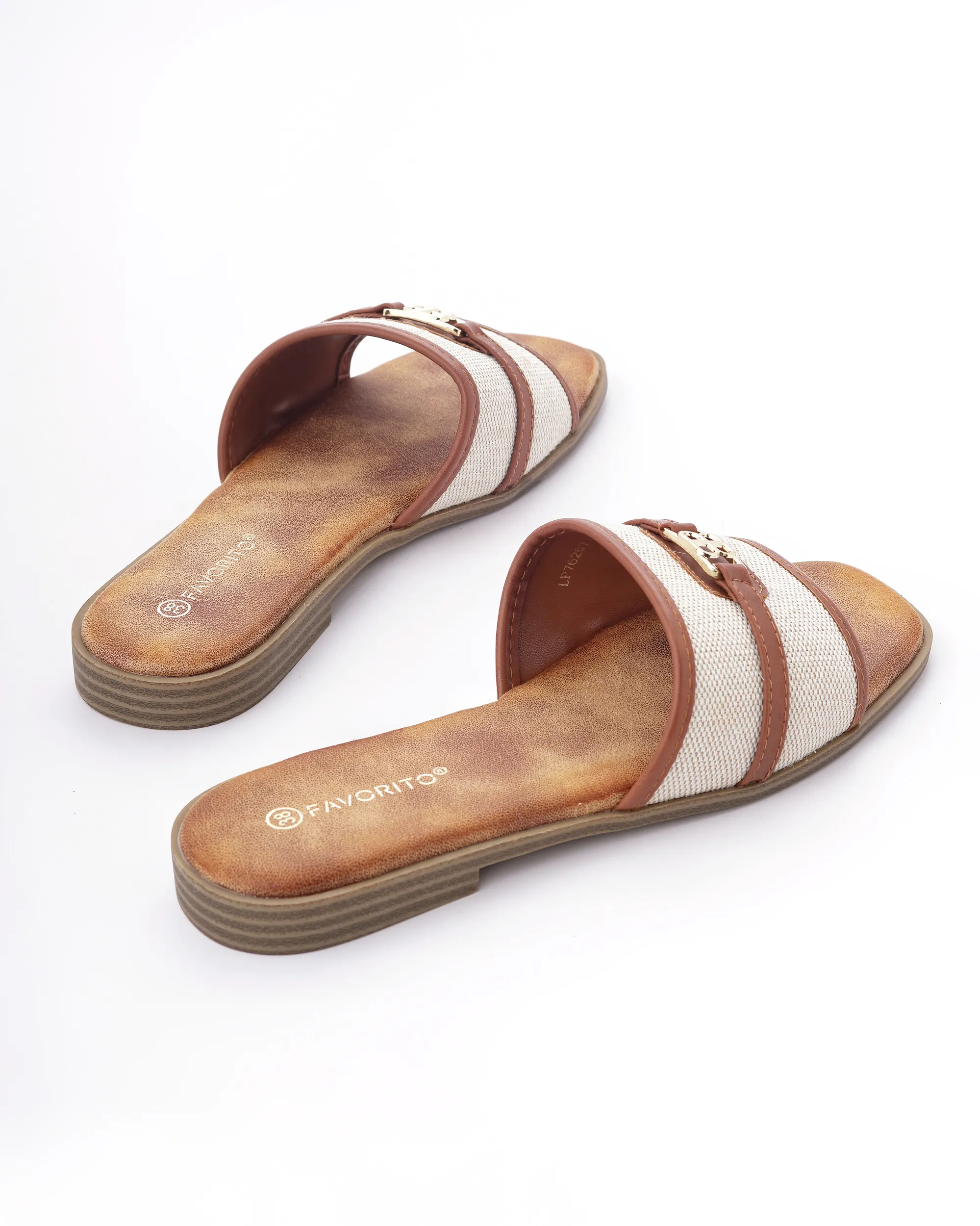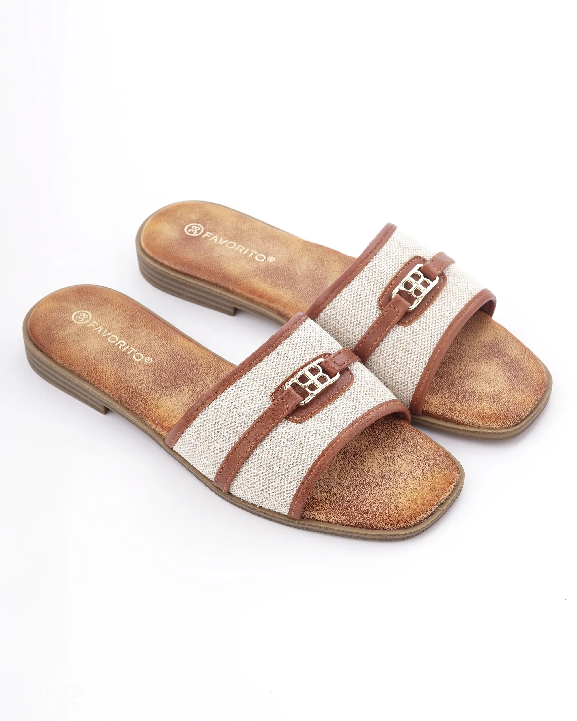 Ove elegantne papuče izrađene su od visokokvalitetne kombinacije tekstila bež boje i detalja od braon eko-kože. Karakteriše ih moderan dizajn sa zlatnom šnalom i ravan đon, što ih čini savršenim i laganim izborom za tople letnje dane.