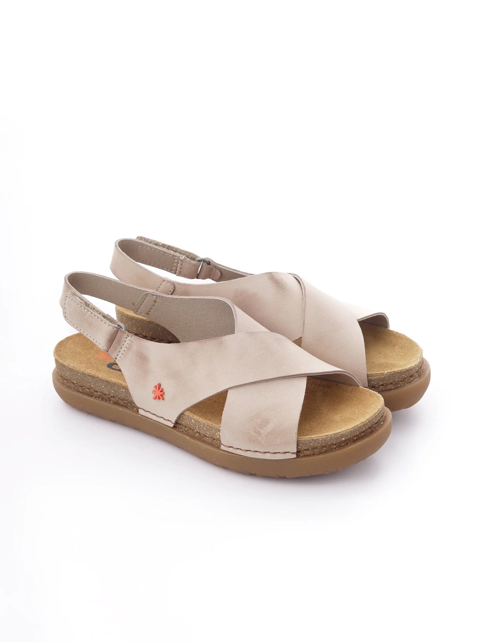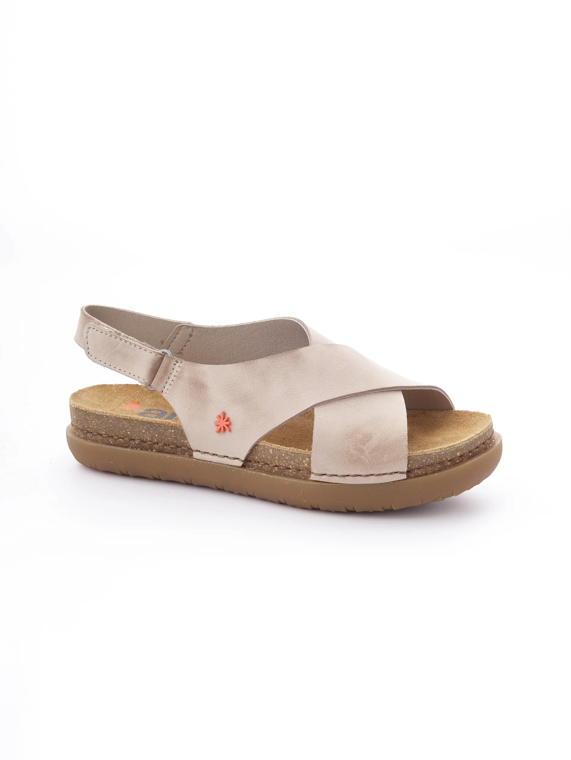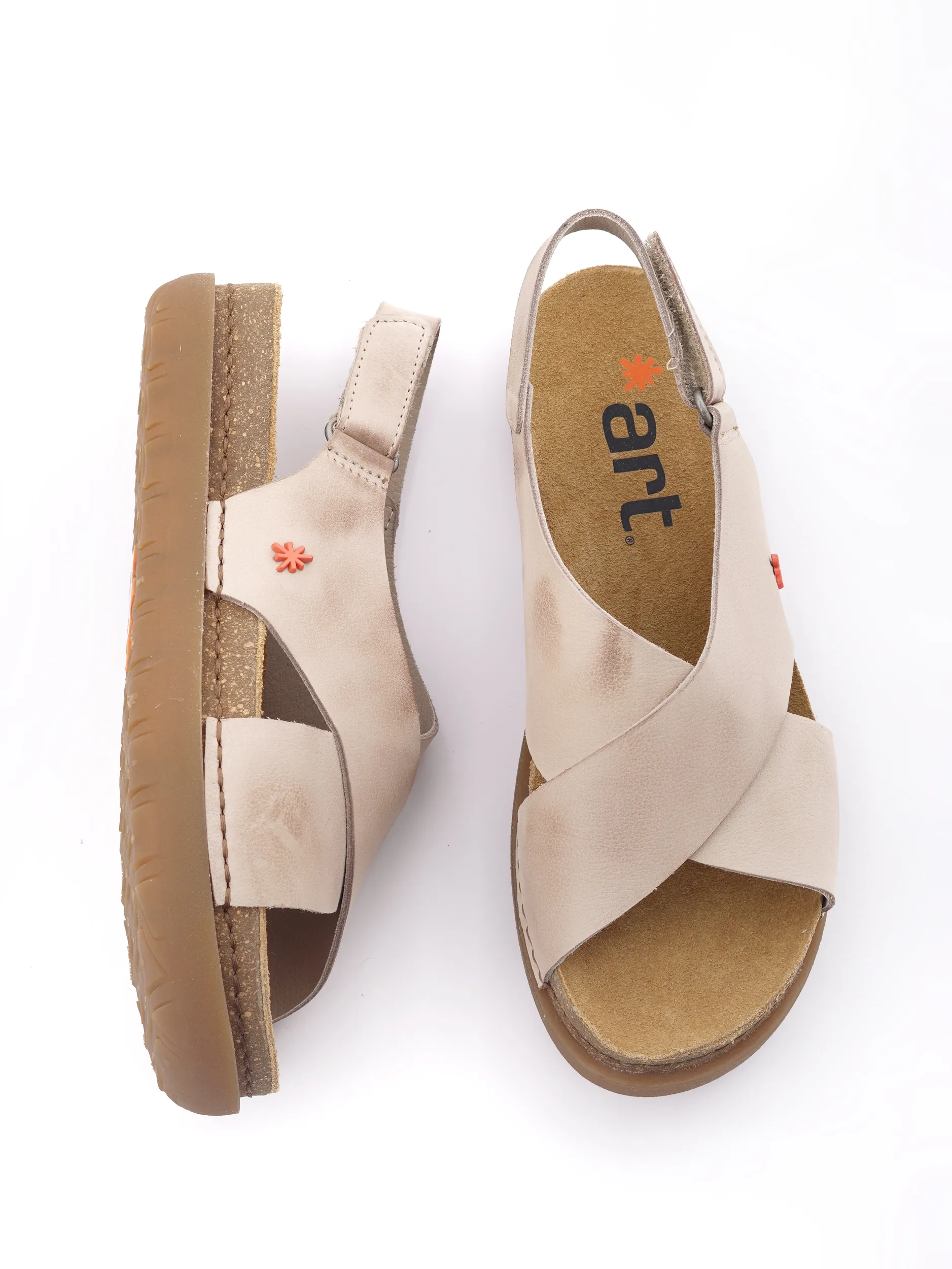 Ove prelepe krem sandale, izrađene su od visokokvalitetne prirodne kože koja garantuje dugotrajnost i vrhunsku udobnost. Prepoznatljive su po modernom dizajnu sa ukrštenim kaiševima i anatomskom đonu od plute, dok diskretni narandžasti logo cveta dodaje autentičan pečat ovom modelu.