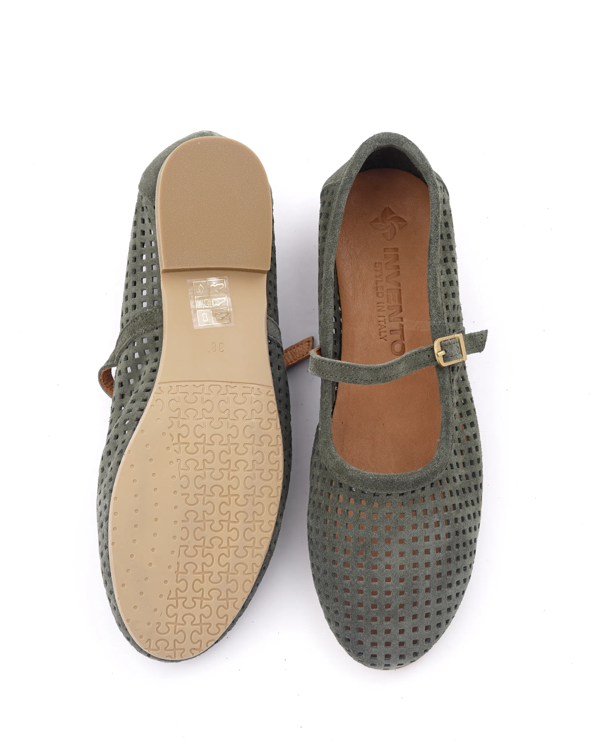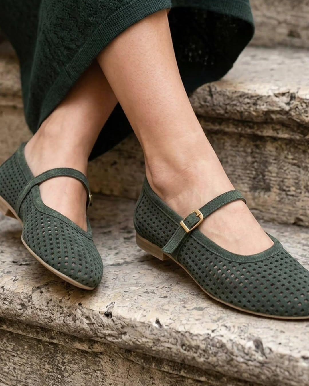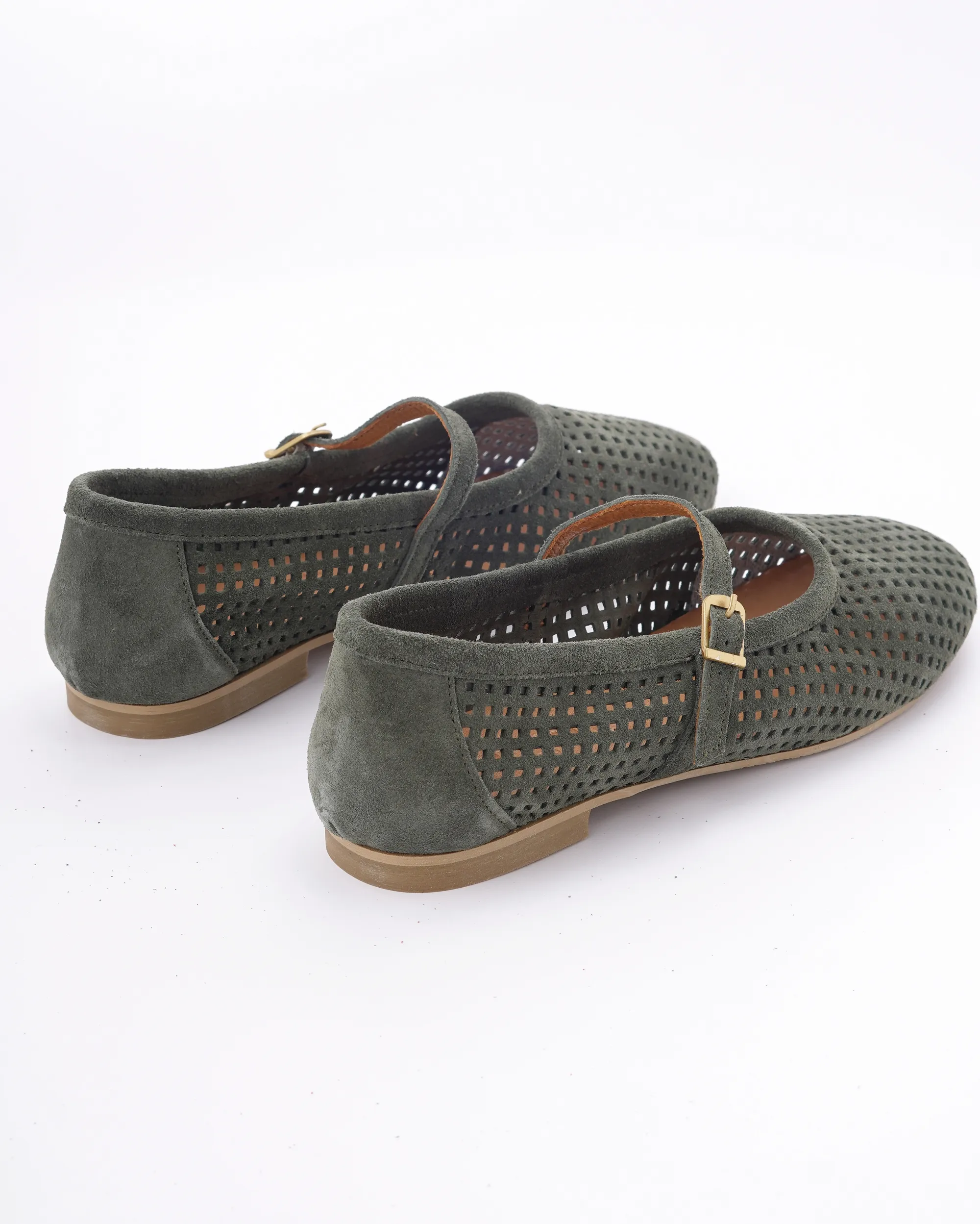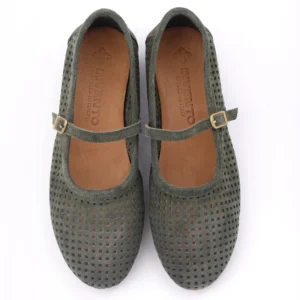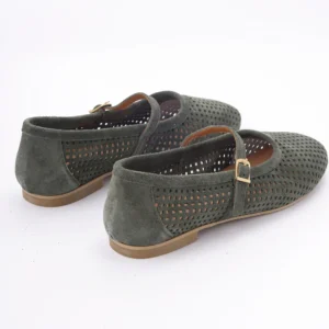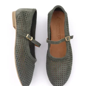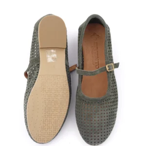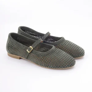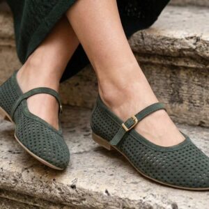 Ove prelepe baletanke u maslinasto zelenoj boji izrađene su od meke prirodne prevrnute kože sa preciznom laserskom perforacijom za maksimalnu prozračnost. Krasi ih klasičan dizajn sa tankim kaišićem i zlatnom kopčom, što ih čini idealnim spojem retro stila i vrhunske udobnosti.