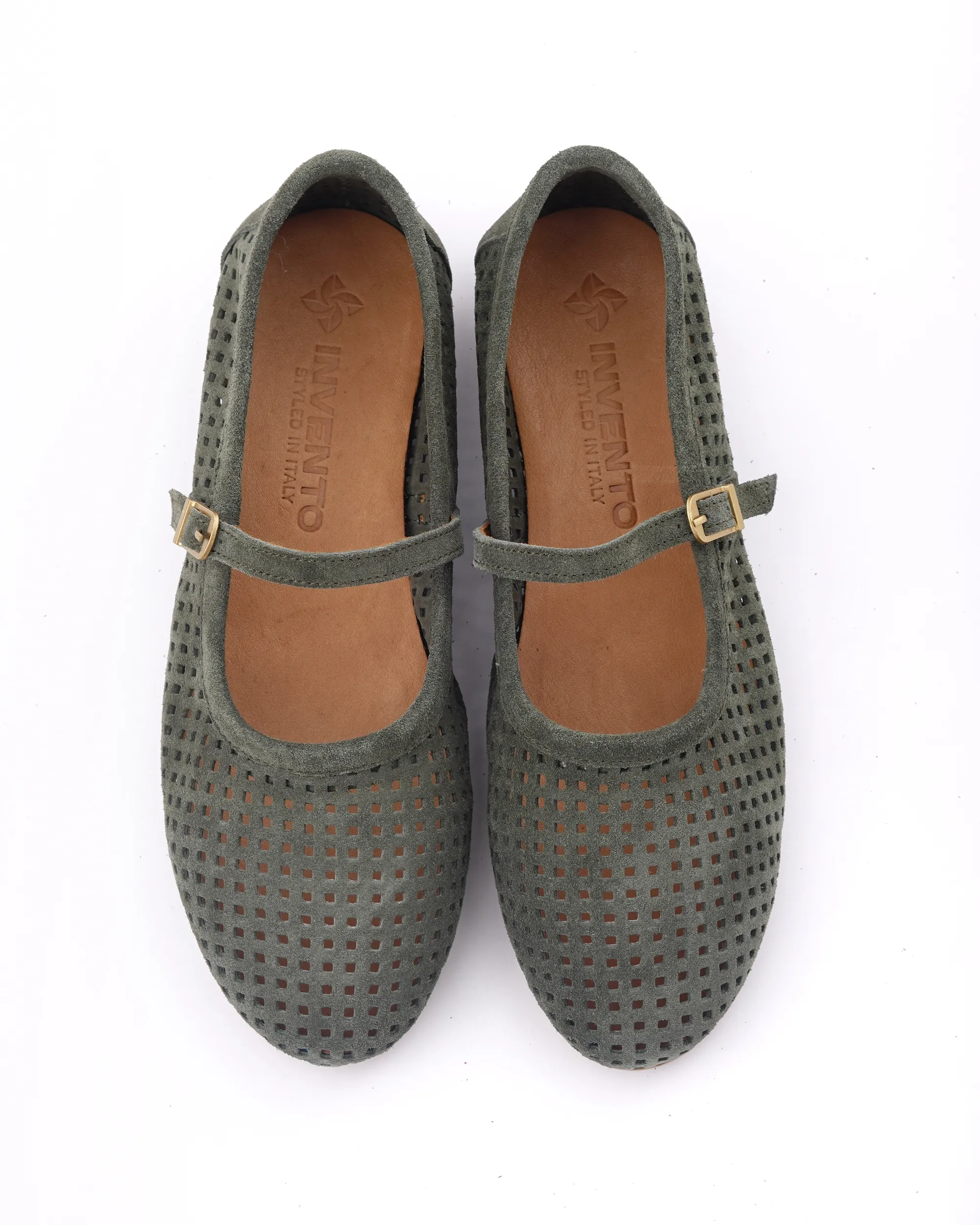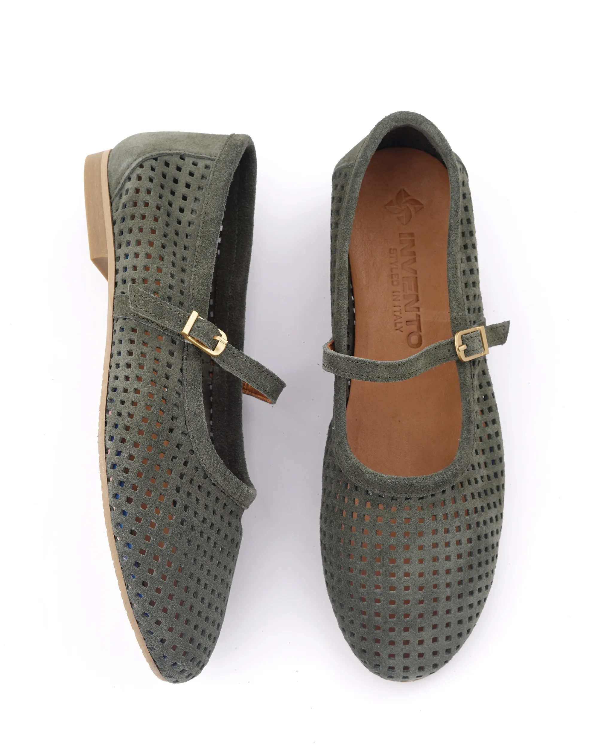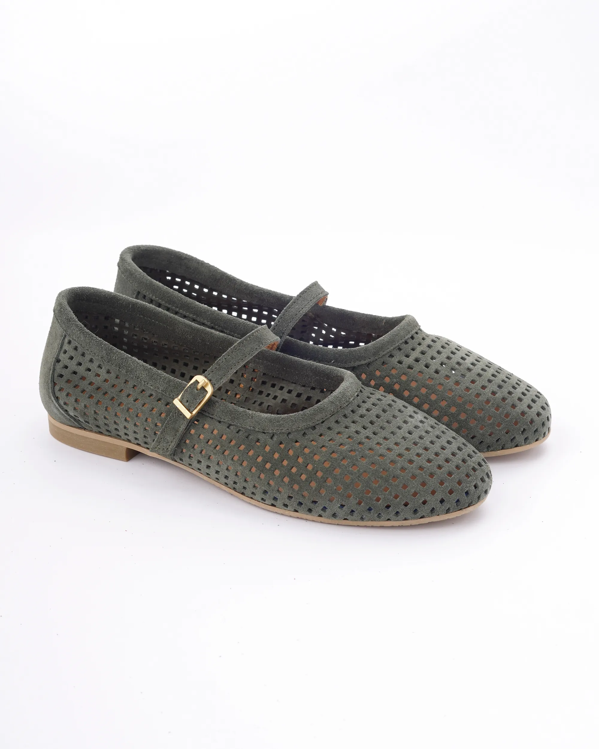 Ove prelepe baletanke u maslinasto zelenoj boji izrađene su od meke prirodne prevrnute kože sa preciznom laserskom perforacijom za maksimalnu prozračnost. Krasi ih klasičan dizajn sa tankim kaišićem i zlatnom kopčom, što ih čini idealnim spojem retro stila i vrhunske udobnosti.