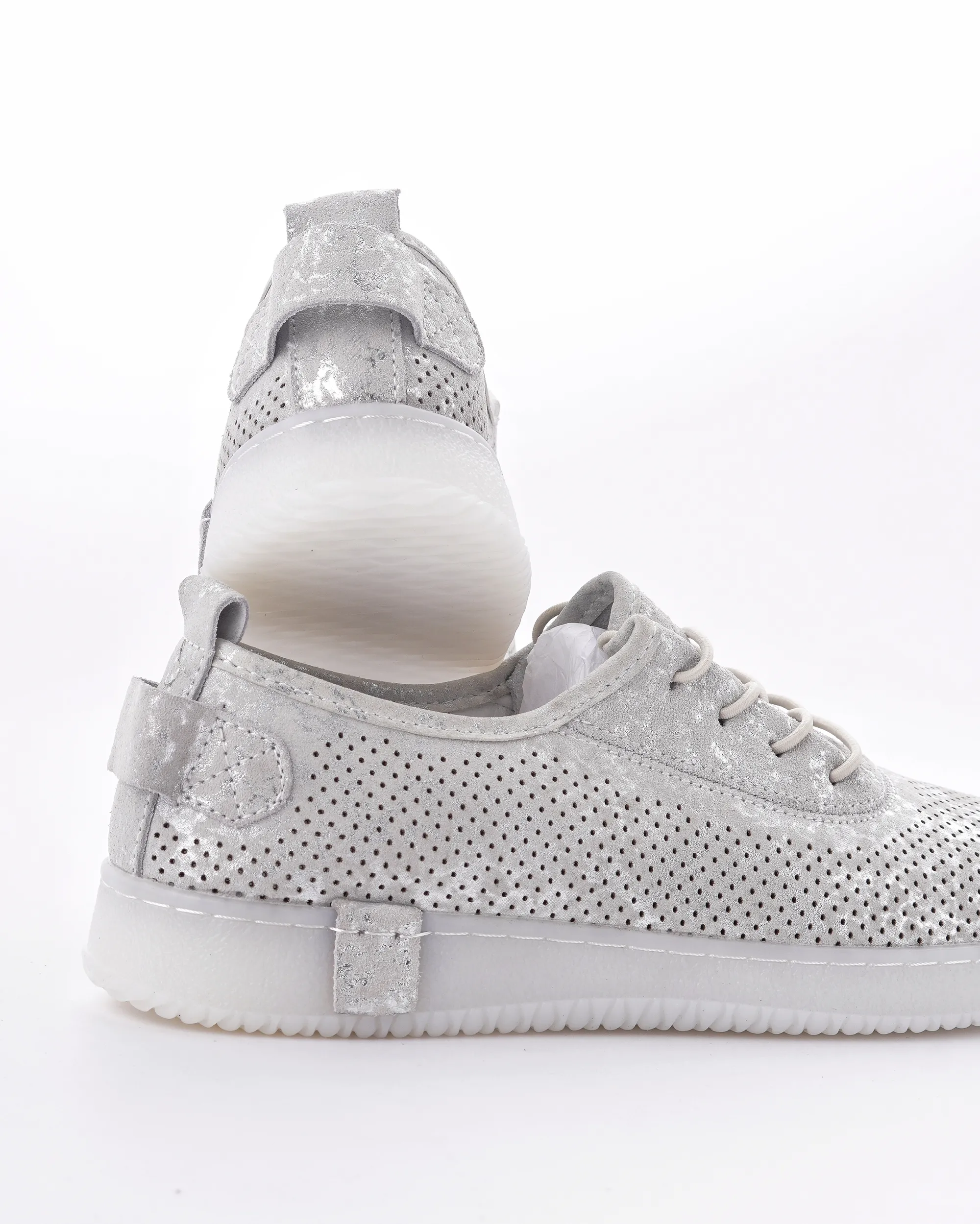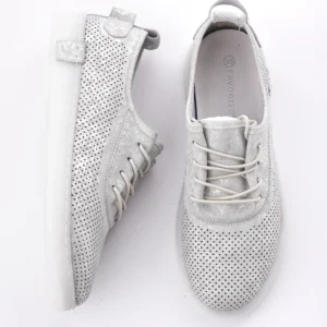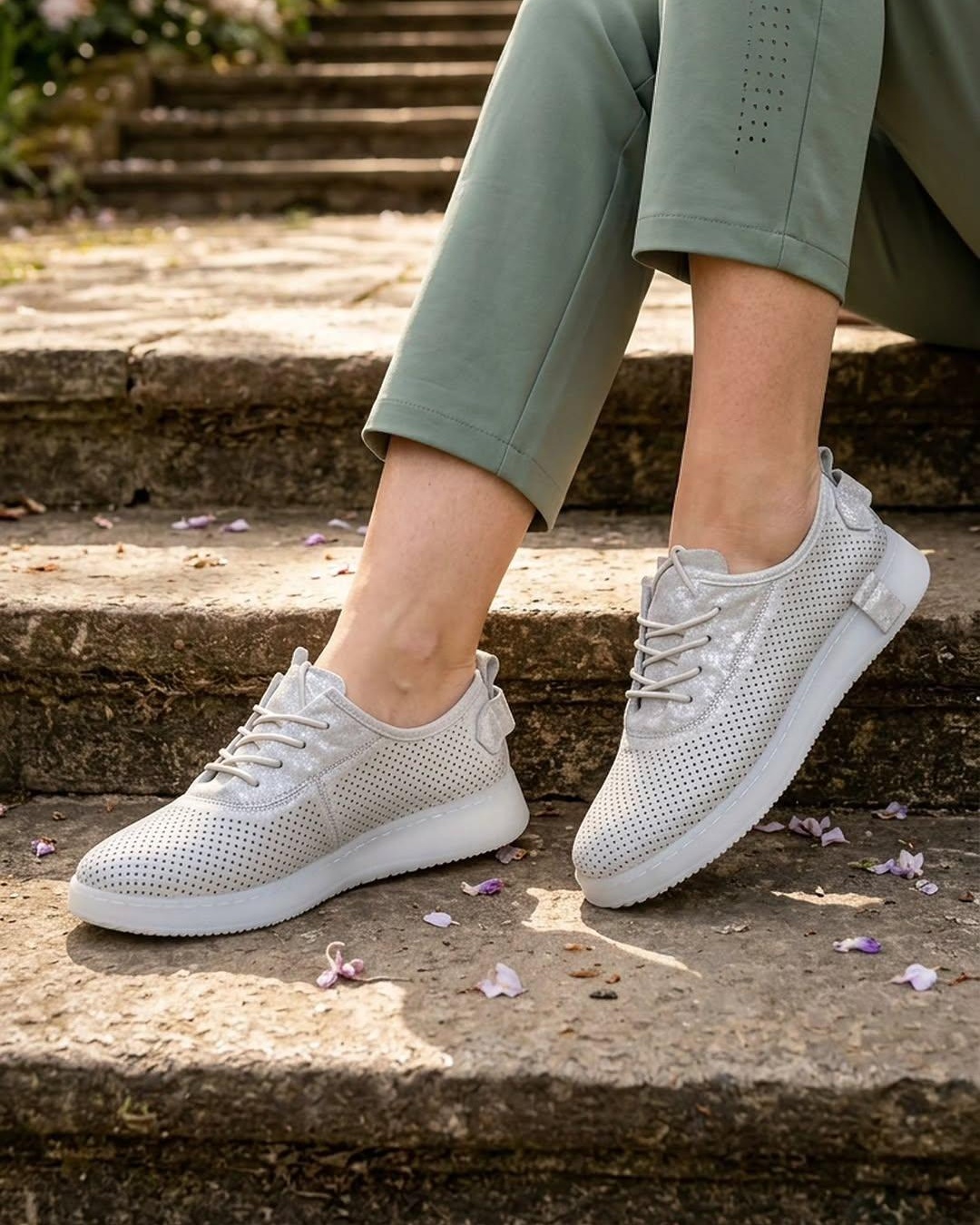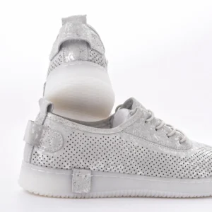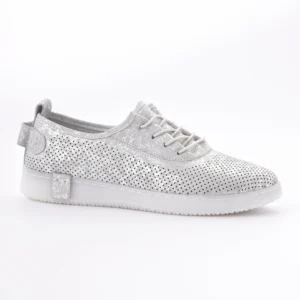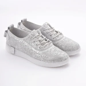 Ove lagane srebrne patike sa laserski sečenim rupicama omogućavaju vrhunsku prozračnost i udobnost tokom celog dana. Karakteriše ih moderan dizajn sa diskretnim sjajnim detaljima i fleksibilan beli đon, što ih čini idealnim za prolećni casual stil.