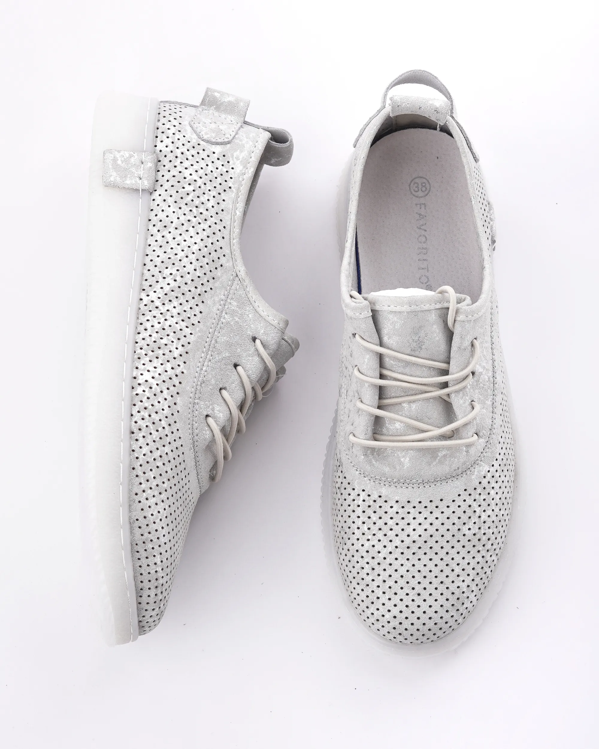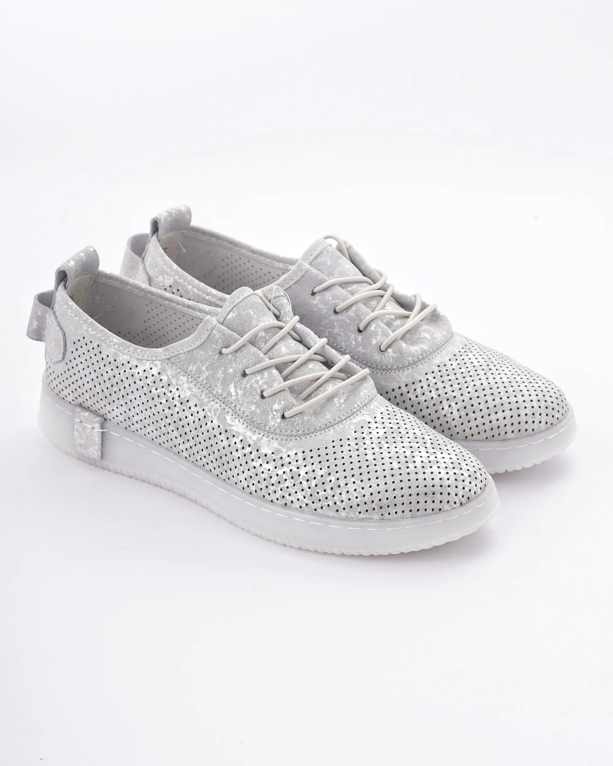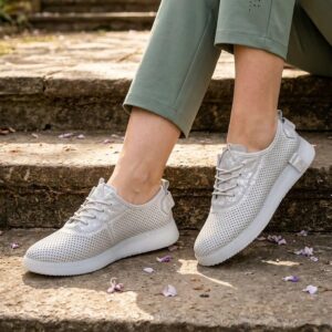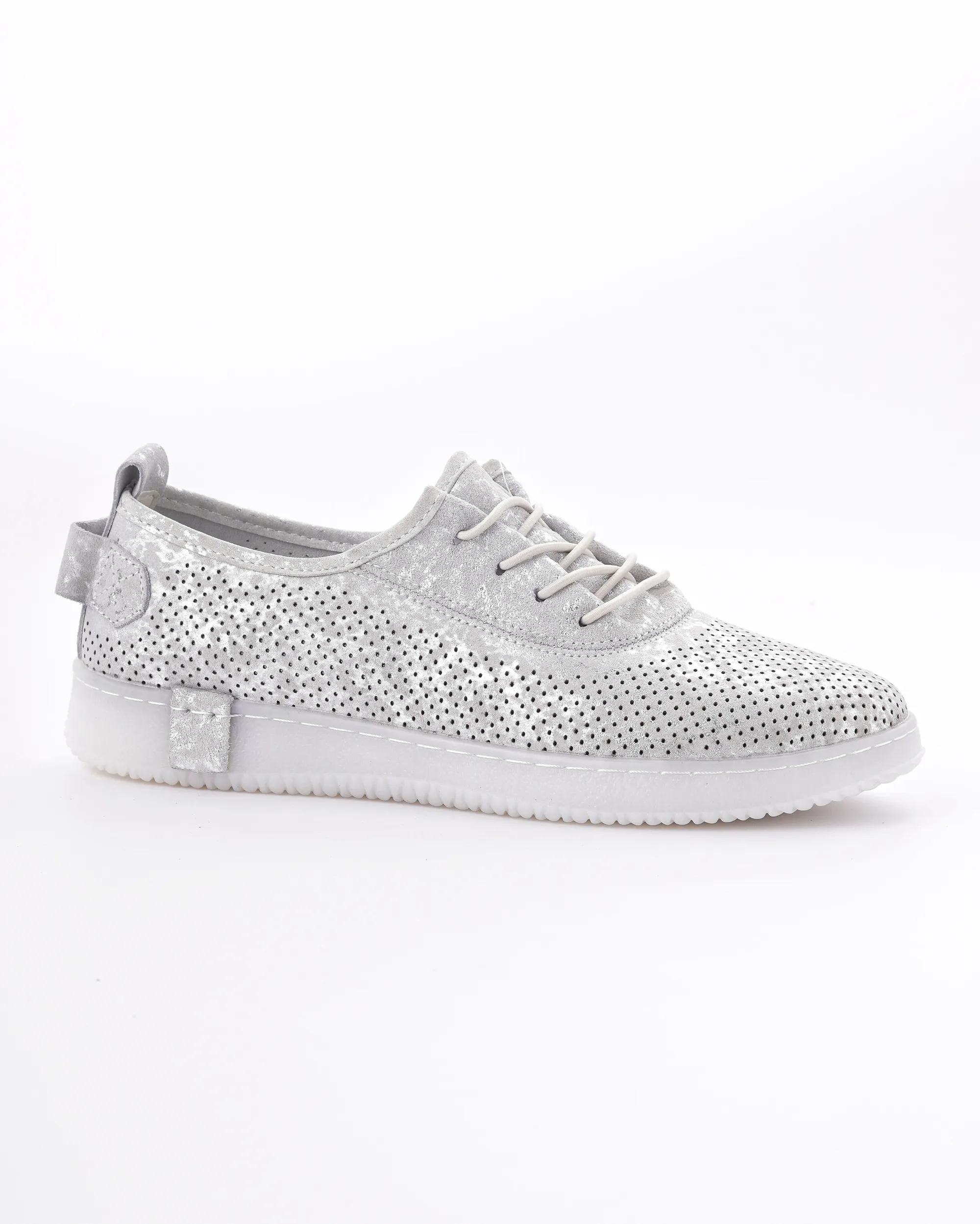 Ove lagane srebrne patike sa laserski sečenim rupicama omogućavaju vrhunsku prozračnost i udobnost tokom celog dana. Karakteriše ih moderan dizajn sa diskretnim sjajnim detaljima i fleksibilan beli đon, što ih čini idealnim za prolećni casual stil.
